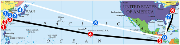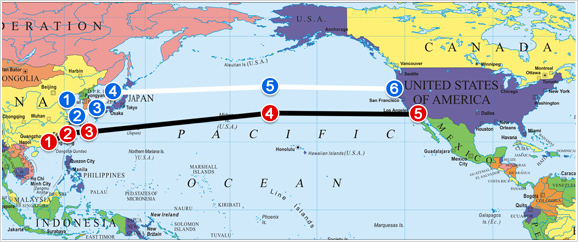| 1 | South China | 2 | Strait of Taiwan | 3 | the East China Sea | 4 | the North Pacific Ocean | 5 | North American west coast |