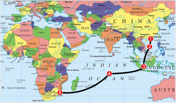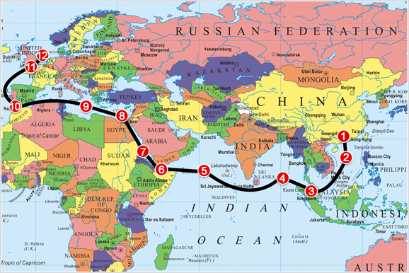 | 6 | G. of Aden | 7 | Red Sea | 8 | Suez Canal | 9 | Mediterranean Sea | 10 | Strait of Gibraltar |